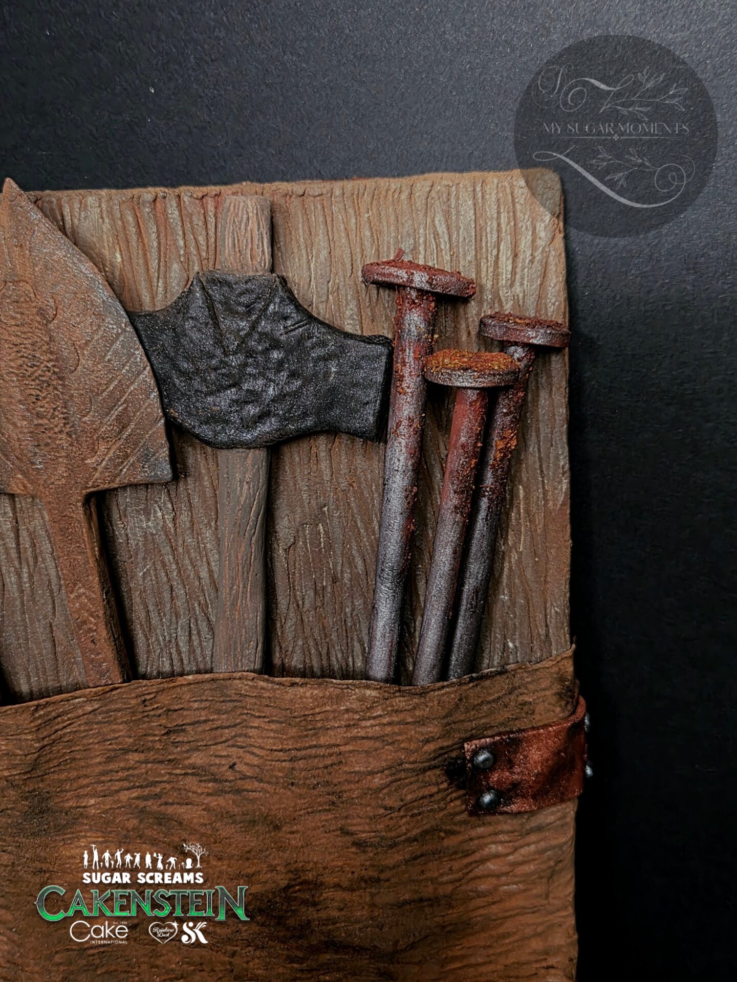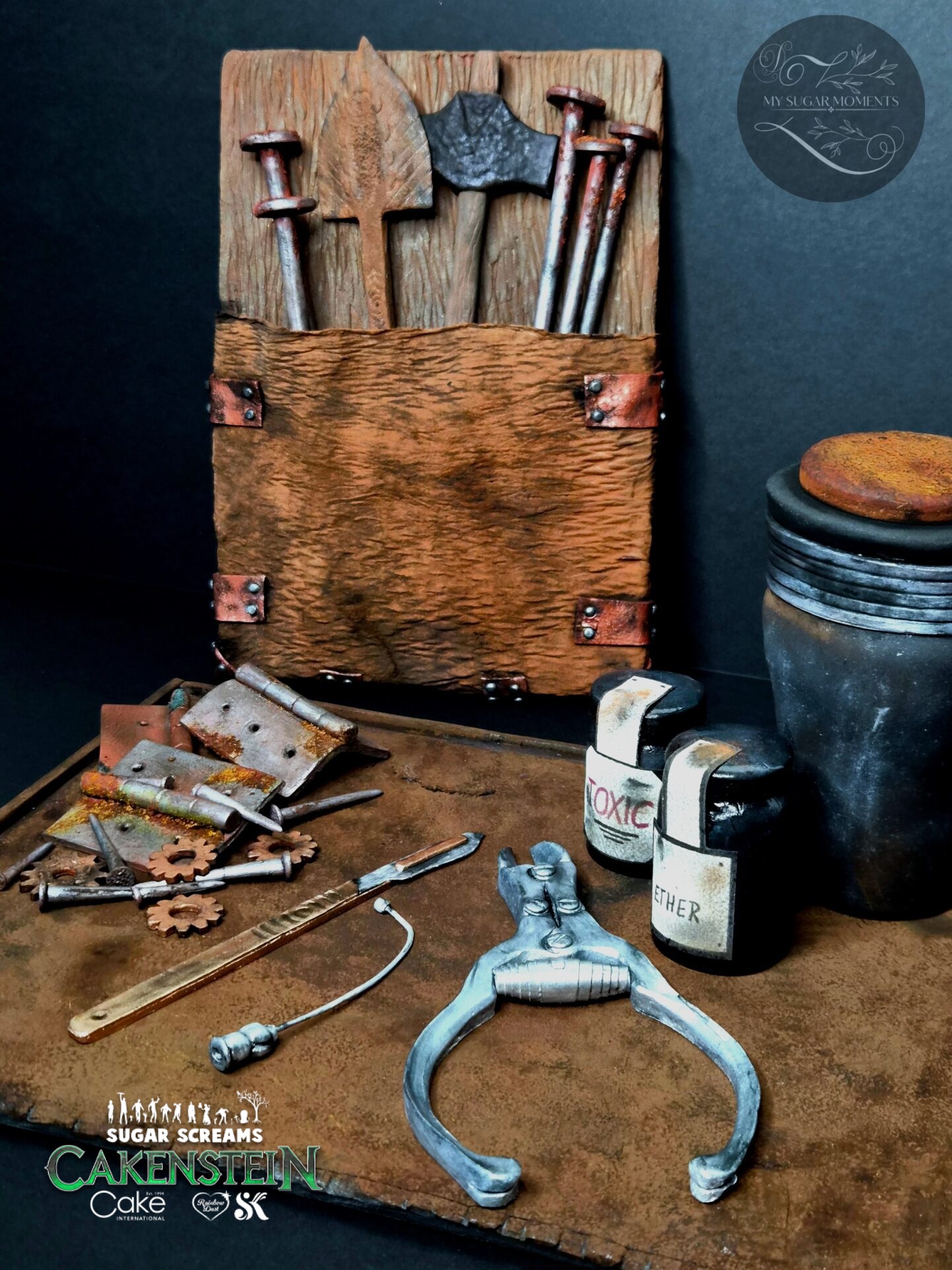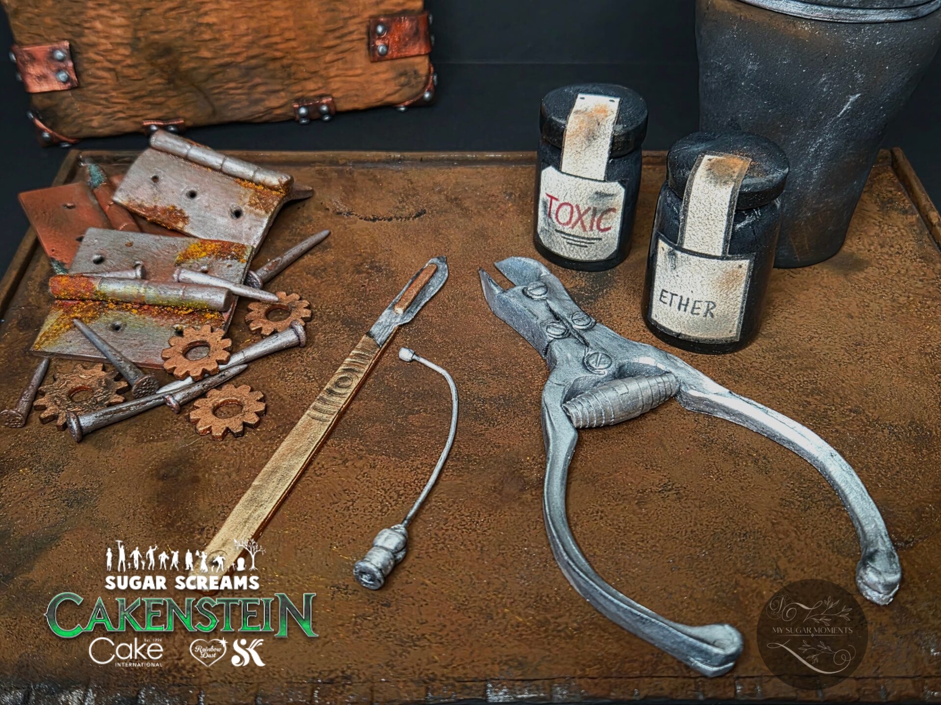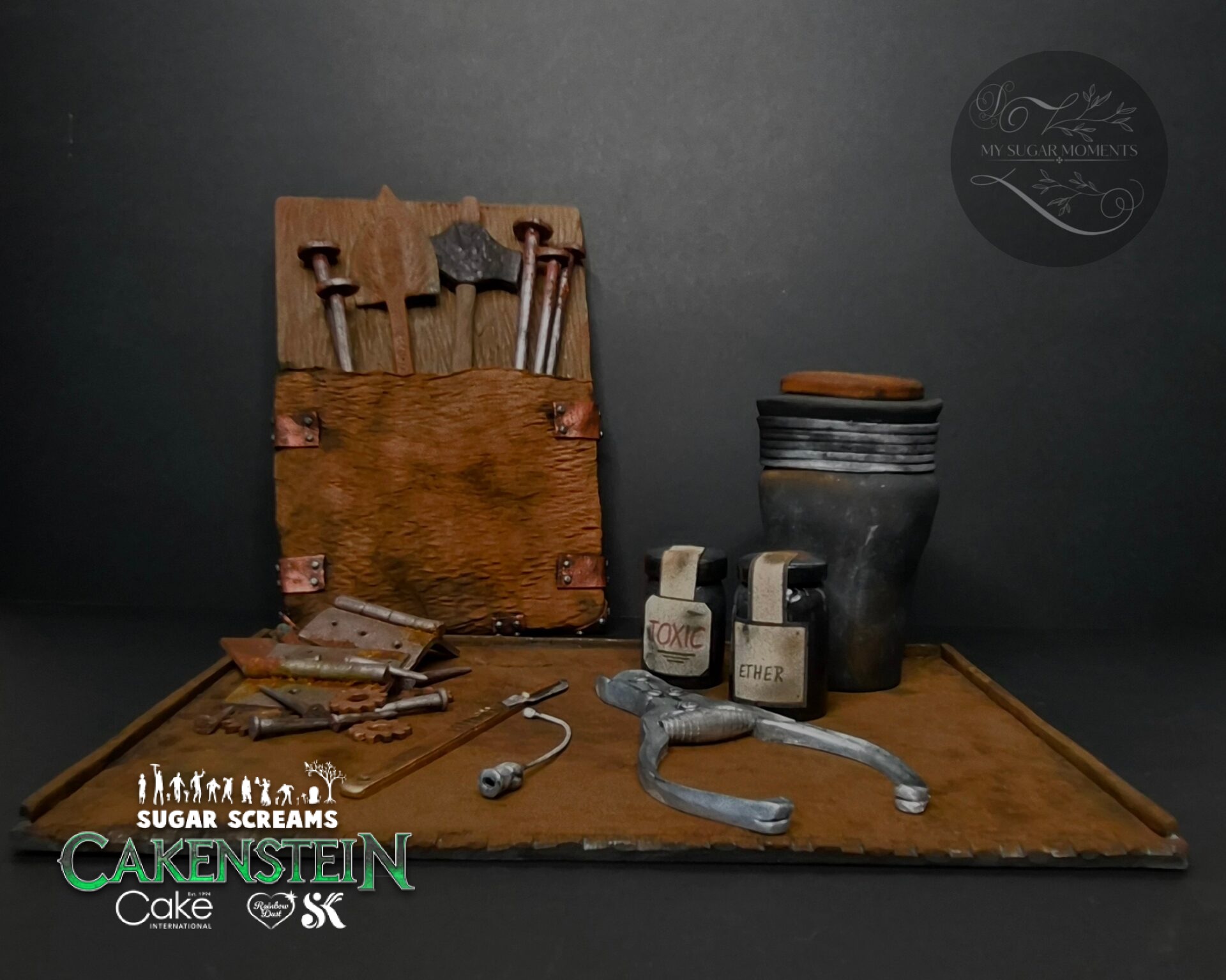 Dr. Cakenstein’s secret laboratory immediately inspired me to write a story. On an old, rusty surgical tray, tools molded from sugar paste, such as a cannula, forceps, and a scalpel, lie ready to begin creating new life. Other handcrafted tools, such as rusty nails, a hammer, and hinges, help hold the newly created life together. Of course, cans of ether and poison are also included, to implement the last note in the lab notebook: “Tonight… I’ll try to wake him up.”