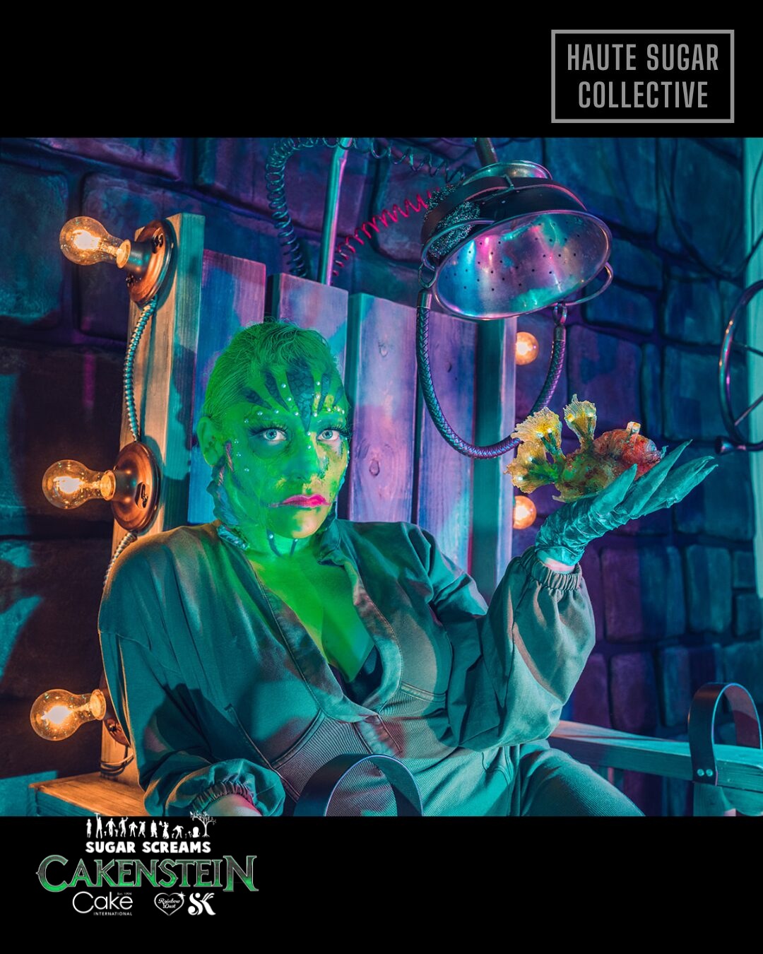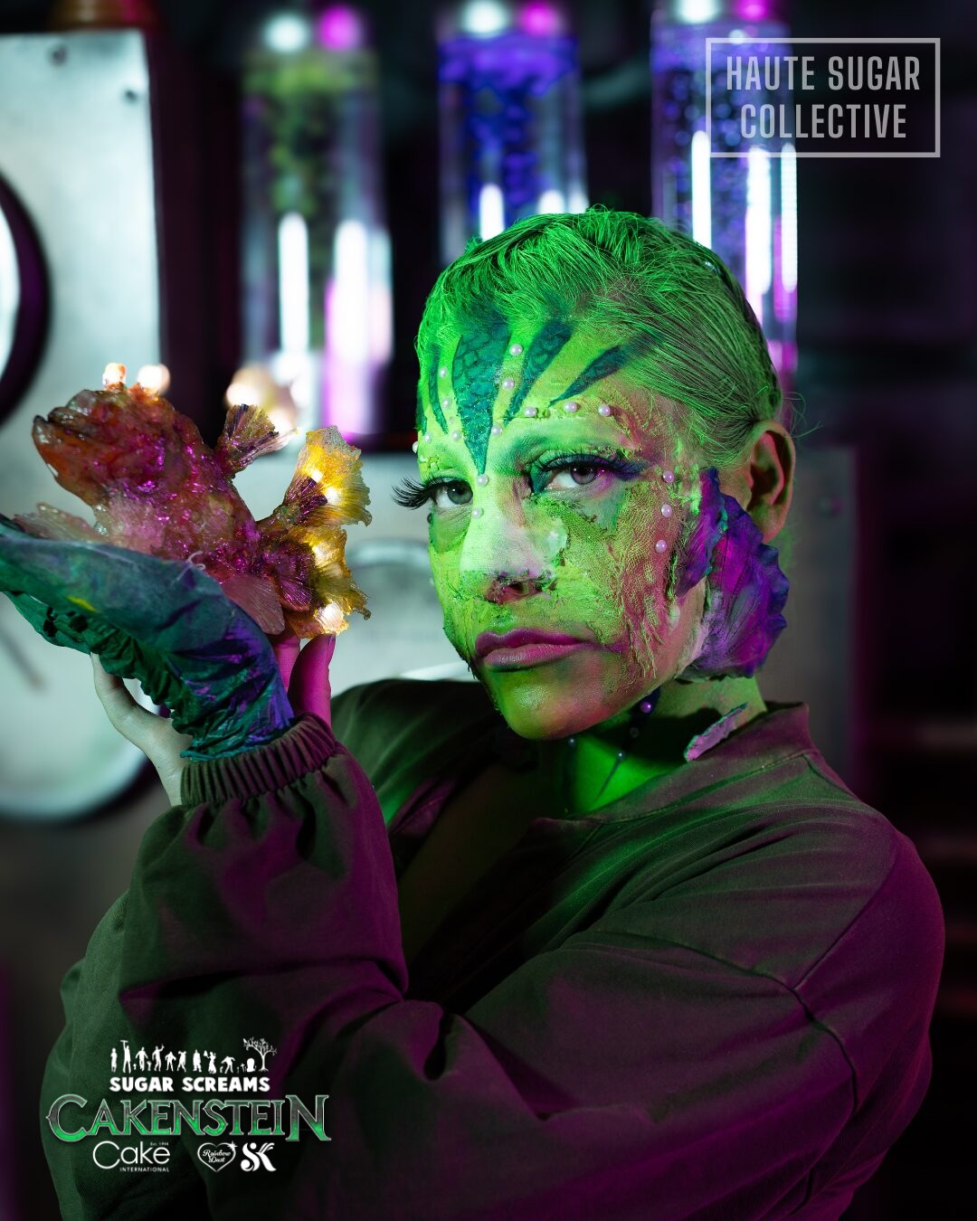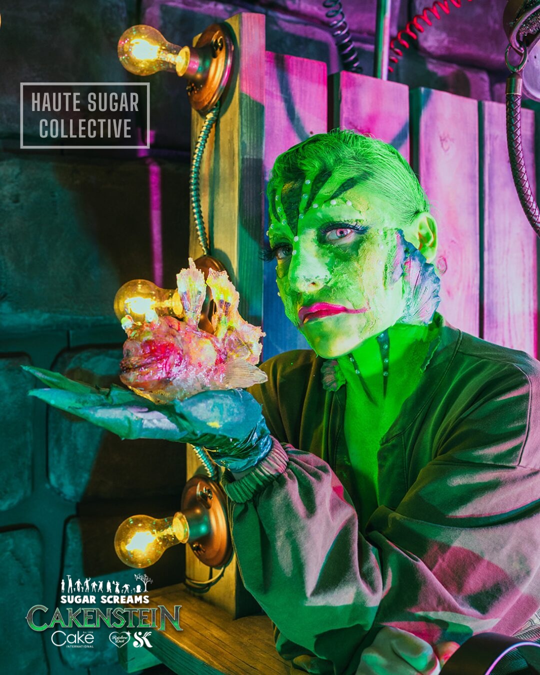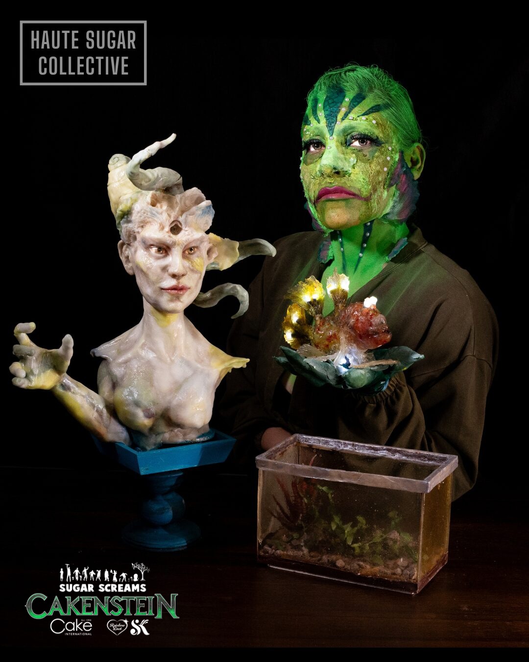 Character + Edible Prop: Emerging from the mysterious ocean abyss, Erandeny is a mesmerizing sea creature whose secrets are as deep as the ocean itself. Accompanied by a glowing, light-up creature companion fresh out of its tank, this creation blurs the line between fantasy and reality. The isomalt fish tank and sculpted underwater details are fully edible, crafted to enchant both the eyes and the taste buds.