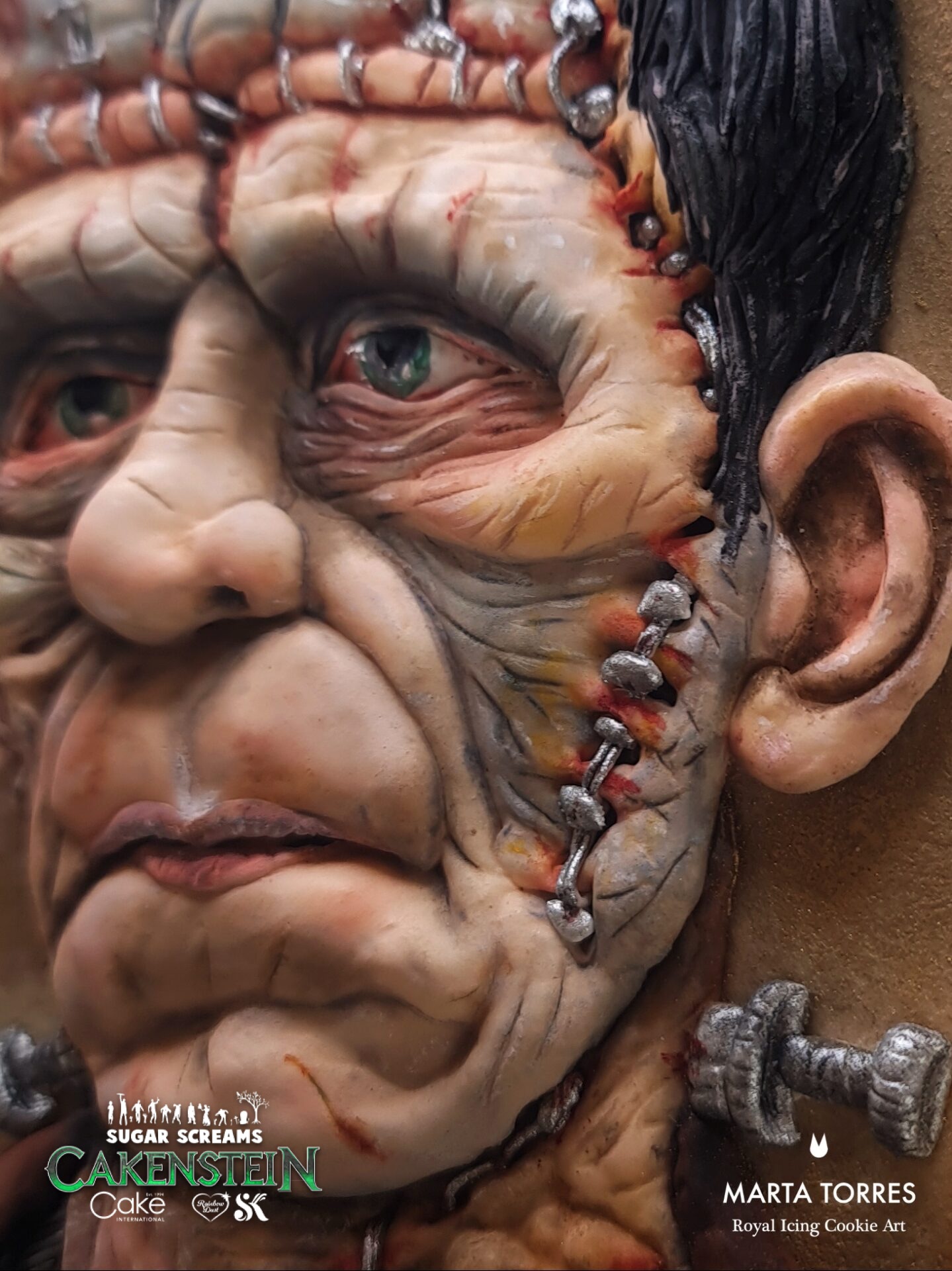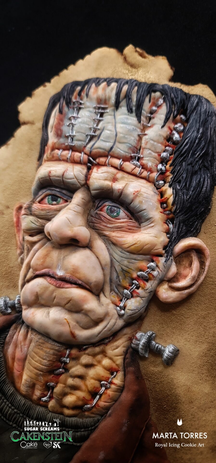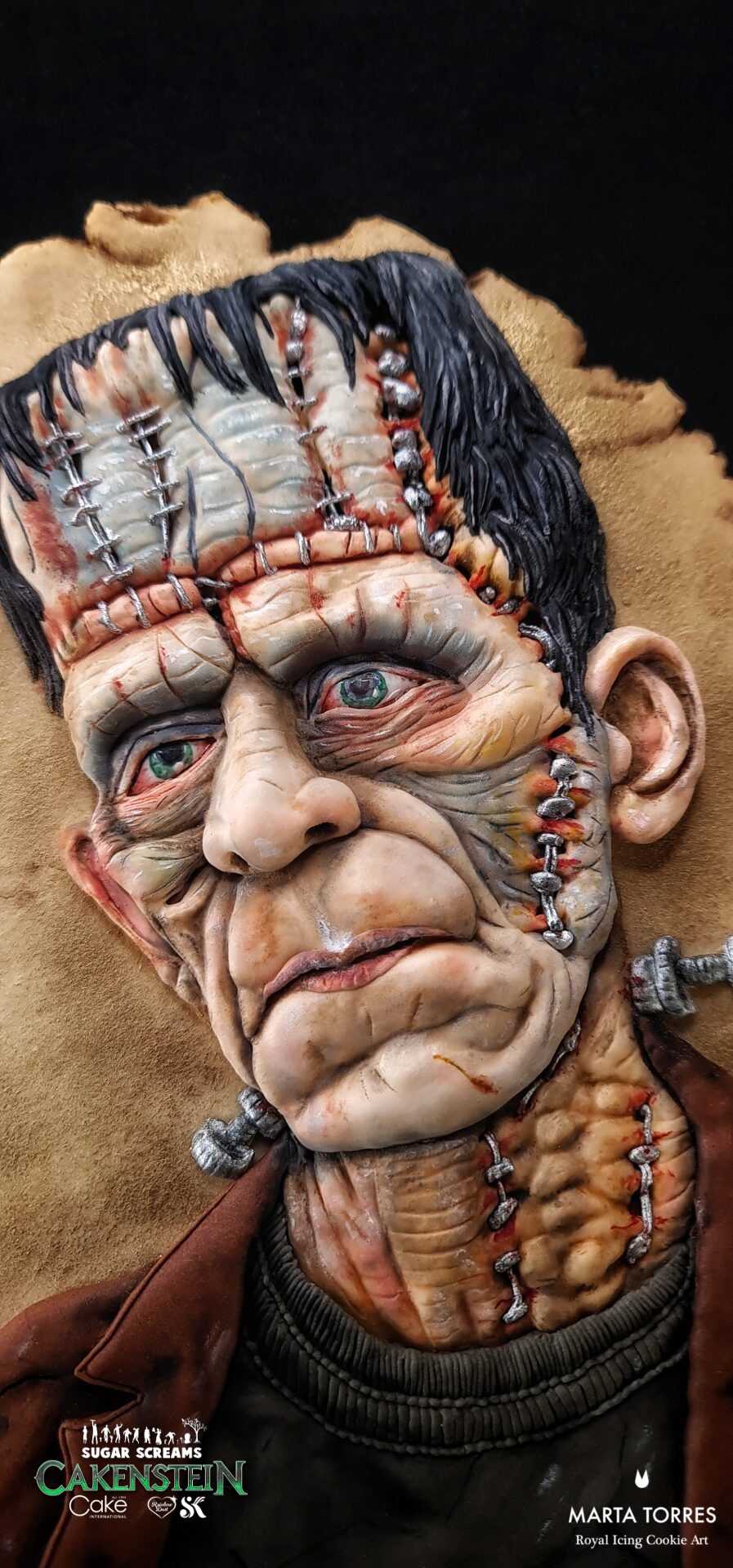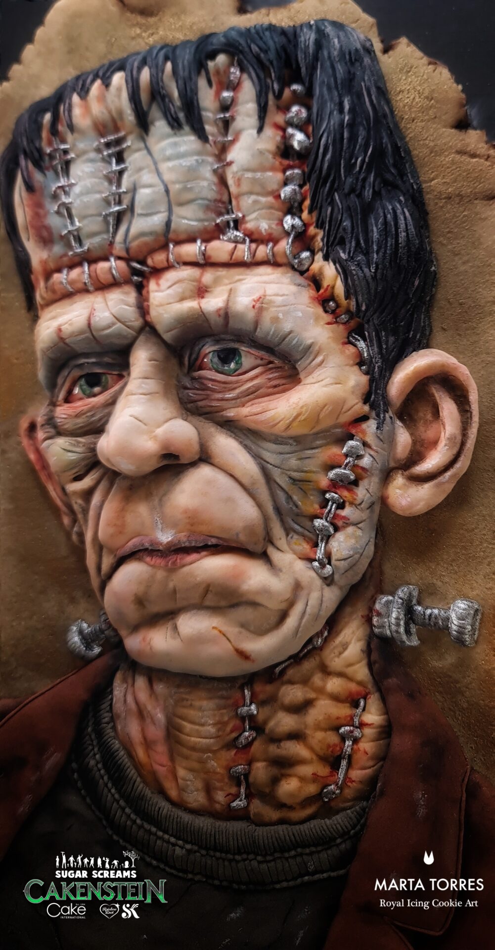 This piece was created to go beyond the idea of a ‘monster’ and capture raw human emotion. Using my dimensional royal icing piping techniques, I focused on depth, shadows, and fine textures to bring life to the stitches, wrinkles, and expression. Every detail — from the glint in the eyes to the tension in the face — was piped and painted by hand to tell a story of sadness, loneliness, and humanity hidden inside Frankenstein’s creature. My goal was not just to decorate a cookie, but to make you feel something when you look at it.