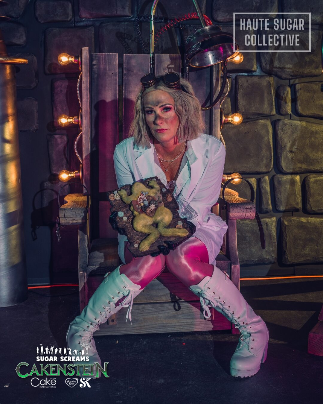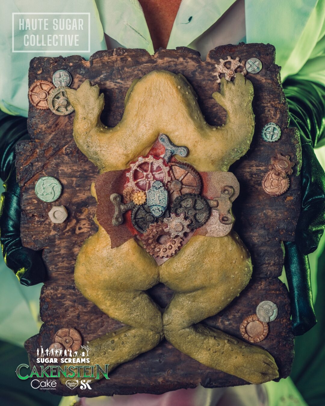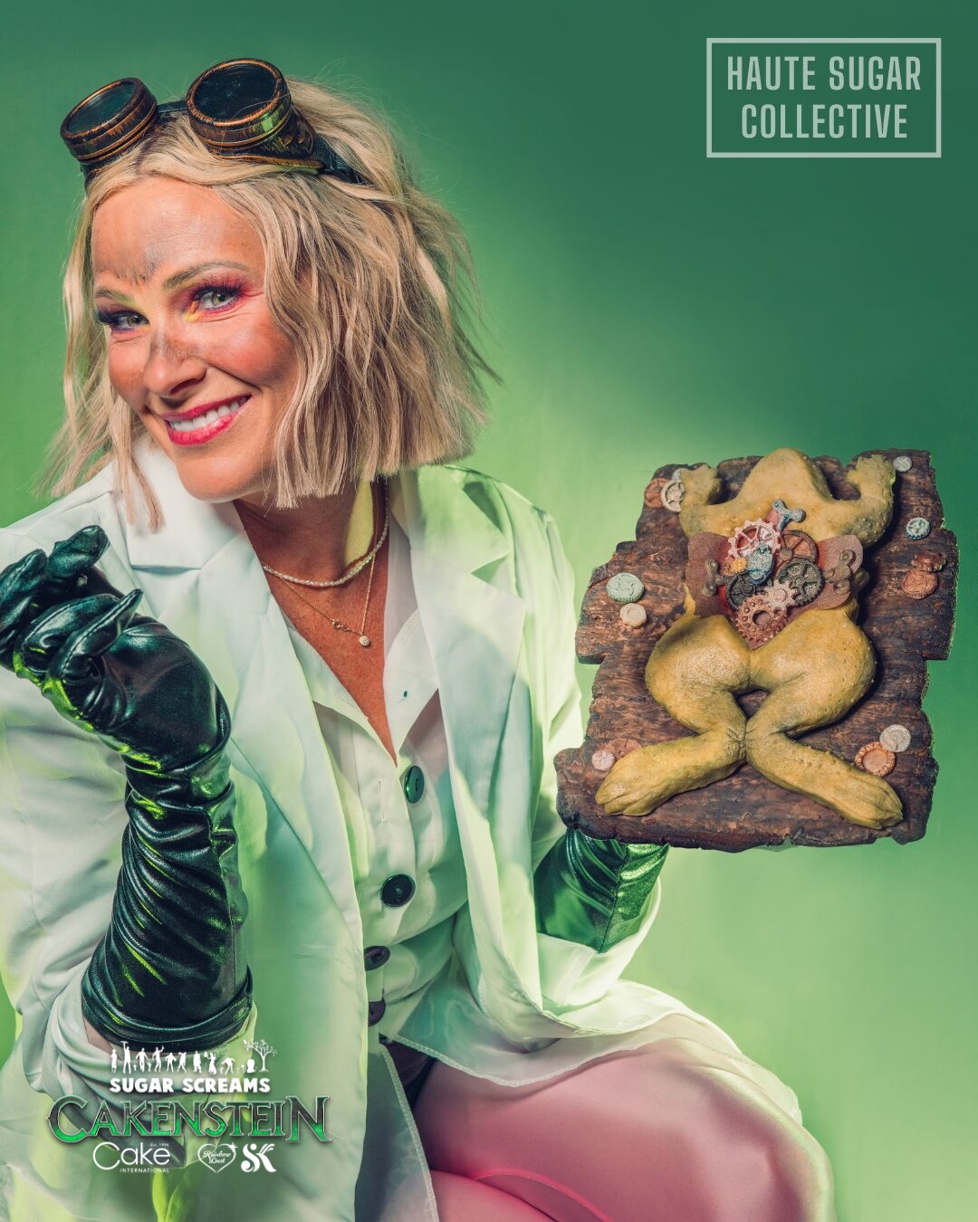 Character + Edible Prop: Mitzi steps into the role of the delightfully deranged Mad Scientist — the mastermind behind the monsters. Surrounded by her edible experiments, she brings her dark imagination to life through an intricately layered 3D cookie creation. Her latest “specimen” is a spliced frog, dissected mid-transformation with exposed organs rendered in painstaking edible detail. Equal parts eerie and exquisite, this edible experiment showcases Mitzi’s precision as a cookie artist and her flair for turning science gone wrong into sugary perfection.